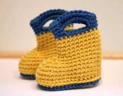 I was just awful at making booties when my own children were babies, but happily, Ive gotten much better now that grandchildren are on the scene. These rain boots are just precious and the nice thing is that they can be worked up for either a boy or a girl. Although these arent at all practical as footwear, they sure are a lot more colorful than my barn mucking boots!