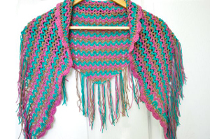 You create the triangle shape by decreasing on each row (1 v-stitch on each side), but instead of working a decreasing stitch, I just started each row 1 stitch closer in. I wrote this pattern to change colors each row and added fringe so those tails do not have to be sewn in (yay!).