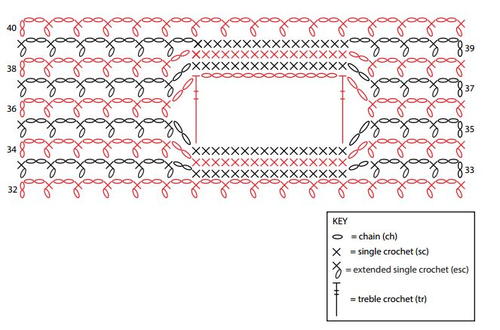 extended single crochet (esc) = Insert hook in indicated stitch, yarn over and pull up a loop, yarn over and draw through one loop on hook, yarn over and draw through both loops on hook.