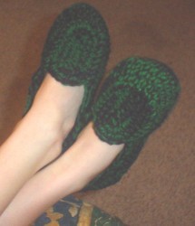 These slippers can be very warm and durable if you use two strands of yarn together. If you use two contrasting colors you can give it a tweed look.