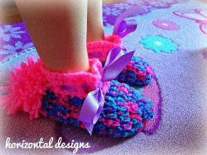 Kids will love slipping their little feet into these colorful crocheted slippers. The Twinkle Toes Toddler Slippers is an easy crochet pattern to work up that requires less than one skein of yarn. These crocheted slippers feature a cute ribbon on top that acts as a tie closure. There's also a decorative pompom on the heel, which kids will also love. Choose from two different sizes - toddler girls 4-5 and 6-7. Crochet slippers don't get much cuter than this!