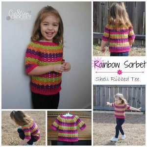 Little girls are sure to have fun wearing this insanely cute crocheted tee. Work up this Happy Day Toddler Tee for the little one in your life using any 4 colors of lightweight yarn you want. This rainbow colored crochet pattern is perfect for the carefree days of spring and summer. Little girls can wear it over a t-shirt or tank top, or you can make a long-sleeved version by adding extra shell rows on the arm.