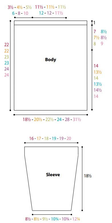 Sew shoulder seams 3½ (4½-5½-6-8-10)” [9 (11.5-14-15-20.5-25.5) cm] in from each armhole edge. Place markers 8 (8½- 9-9½-9½-10)” [20.5 (21.5-23-24.5-24.5- 25.5) cm] down from shoulder seams on Front and Back. Sew in Sleeves between markers.