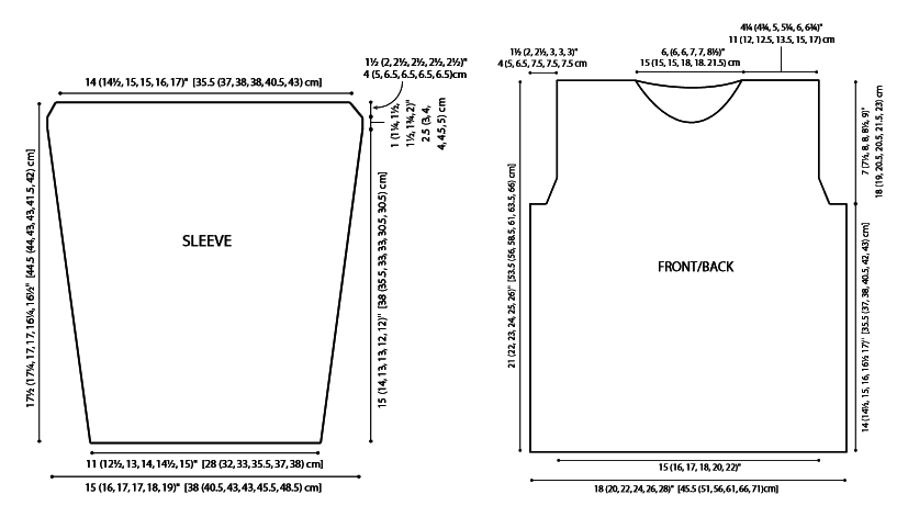 - Sweater is made with front, back, and two sleeves sewn together and allows for 4” (10 cm) of ease.