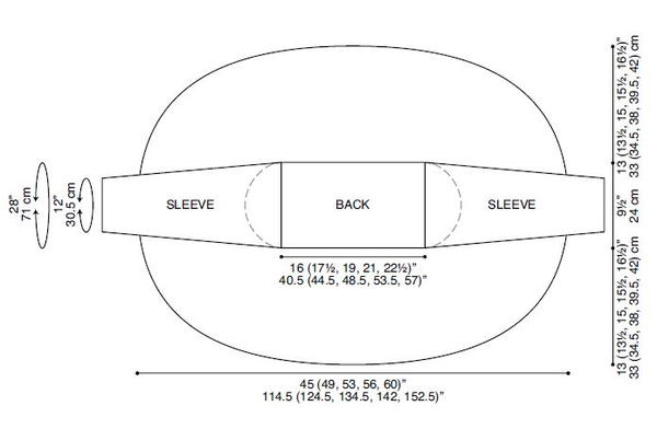 - Finished Bust: 45 (49, 52, 56, 60)” (114.5 [124.5, 132, 142, 152.5] cm) in circumference (lapels to be folded back)