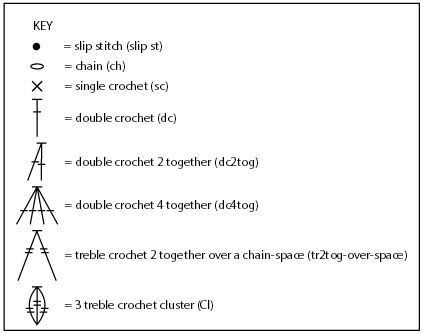 - tr2tog-over-space (treble crochet 2 stitches together over a chain-space)