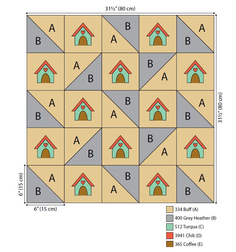 With yarn needle using running stitch, sew doorway to lower edge of doghouse at center. Sew doghouse to center of solid color square, making sure to leave enough room at top of doghouse for roof. Sew roof to top of doghouse. With D, embroider heart at center of doghouse above doorway as shown.