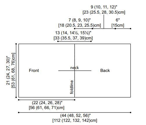 Fold piece in half, lining up side edges for bottom edge. Mark each side of folded edge for shoulder. Measure down 7 (8, 9, 10)" [18 (20.5, 23, 25.5)cm] from marked shoulder edge and mark for armhole. Measure up 6" [15cm] from lower edge and mark. Sew between markers on each side to create a side seam. Weave in ends.