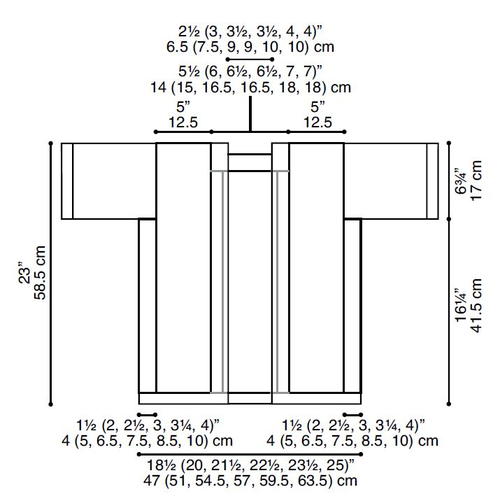 Finished SizeDirections are for size Small (S). Changes for sizes Medium (M), Large (L), X-Large (XL), 2X-Large (2X), and 3X-Large (3X) are in parentheses. To Fit Bust: 35 (37, 39, 41, 43, 45), [89 (94, 99, 104, 109, 114.5) cm].