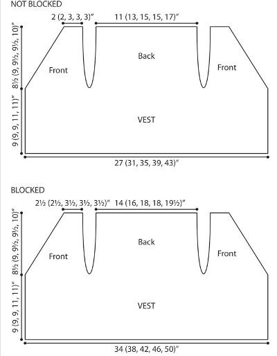 NotesVest is worked in one piece from lower edge up to underarm. The piece is divided for armholes. The back and fronts are then worked separately up to shoulders.