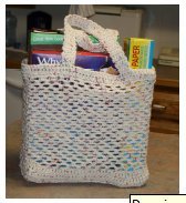 If you don't have any extra thread, but have a lot of left over plastic grocery sacks. Cut off the bottom. Leave the sides intact. Cut the bag into 1" strips. Mix &/or match colors. Using any pattern use the strips to crochet the tote, leave the ends on the outside for "decoration" or put inside for a cleaner look. The work great. Have made bottle totes for walkers with these. AND they are stronger than the original bag.