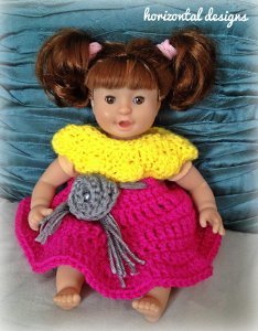 My grandniece is just getting old enough to enjoy the pleasures of a doll like this. When she was younger she just likes to undress the babies. Now she is enjoying dressing them. I plan on crocheting this little number along with the matching headband. Thank you for the free pattern.
