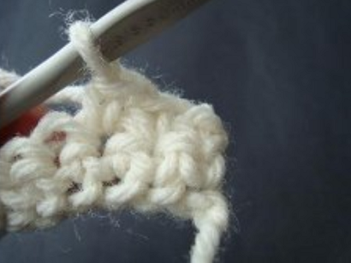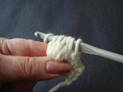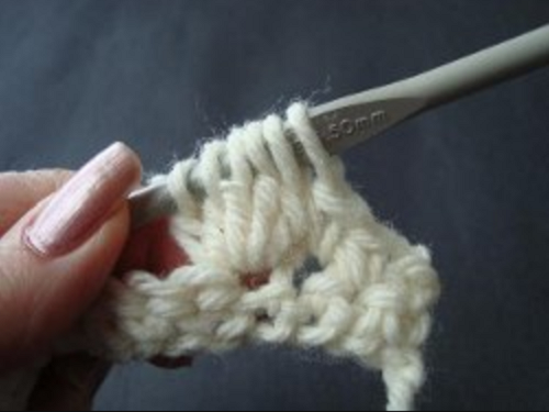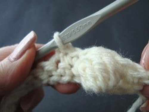Chain 1 and turn, single crochet in the next 2 stitches. * In the next stitch, make 5 double crochet, keeping the last loop of each stitch on the hook.