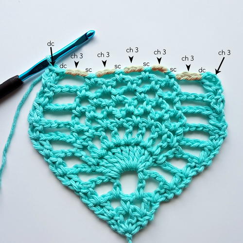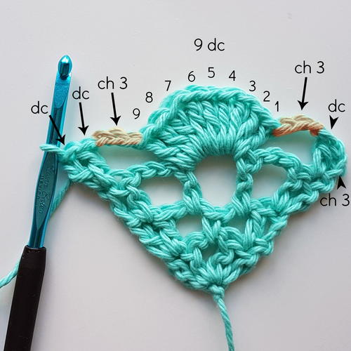 R4: Ch 3, 1 dc in the first dc, ch 3, sk the next dc, sk the next ch3sp, sk the next dc, 9 dc in the ch3sp, ch 3, sk the next dc, sk the ch3sp, sk the next dc, 2 dc in the last dc. Turn. (13 dc, 2 ch3sp)