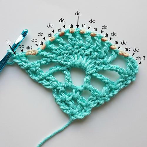 R13: Ch 3, 1 dc in the first dc, ch 2, sk the next dc, sk the ch3sp, sk the next sc, 1 sc in the next ch3sp, ch 2, sk the next sc, sk the next ch3sp, sk the next dc, 2 dc in the last dc. Turn. (1 sc, 4 dc, 2 ch2sp)