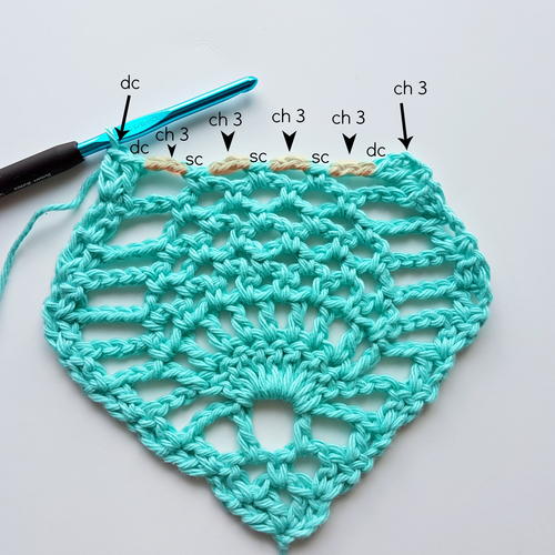 R12: Ch 3, 1 dc in the first dc, ch 3, sk the next dc, sk the ch3sp, sk the next sc, 1 sc in the next ch3sp, ch 3, sk the next sc, 1 sc in the next ch3sp. Ch 3, sk the next sc, sk the next ch3sp, sk the next dc, 2 dc in the last dc. Turn. (2 sc, 4 dc, 3 ch3sp)