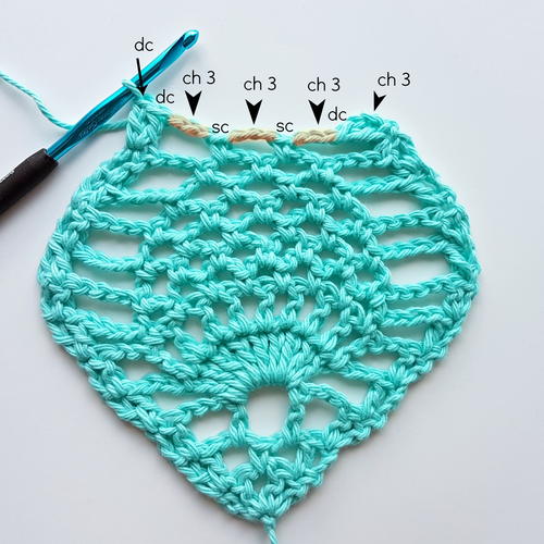 R10: Ch 3, 1 dc in the first dc, ch 3, sk the next dc, sk the next ch3sp, sk the next sc, 1 sc in the next ch3sp, *ch 3, sk the next sc, 1 sc in the next ch3sp**. Rep from * to ** 3 times. Ch 3, sk the next sc, sk the next ch3sp, sk the next dc, 2 dc in the last dc. Turn. (4 sc, 4 dc, 5 ch3sp)