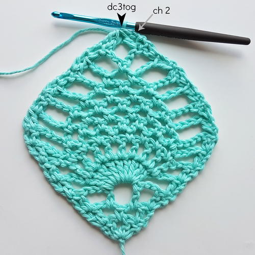 R14: (Ch 2, dc3tog) [together counts as dc4tog], sk the next ch2sp, sk the next sc, sk the next ch2sp. (1 dc)