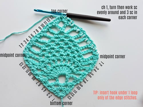 Round 1: Work 13 sc evenly across to the midpoint, 3 sc in the next edge, work 13 sc evenly to the bottom corner. 3 sc in the bottom corner. Work 13 sc evenly across to the other midpoint, 3 sc in the next edge, work 13 sc evenly to the top corner, 2 sc in the corner. Sl st to the first sc to join, ch 1, turn. (64)