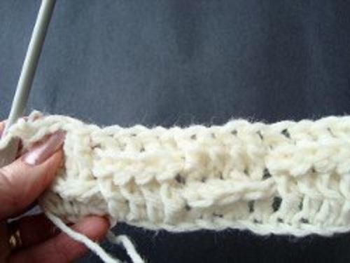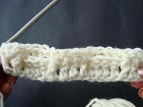 Photo shows 6 rows completed of basket-weave stitch, plus the foundation row of double crochet stitches.