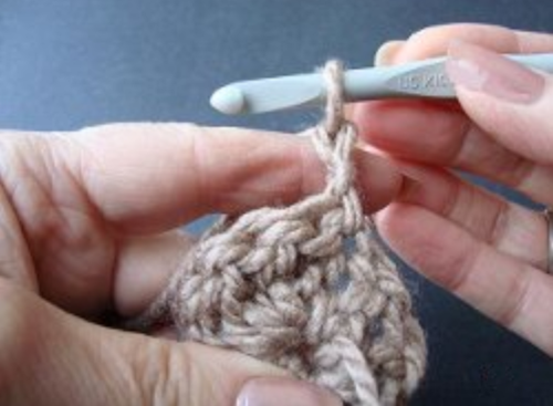 NOTE: In the photo below, see that the hook actually passes under two strands of yarn. It may seem that you have gone over one stitch too far, however, the stitch before this one does not have two strands to pass the hook under.